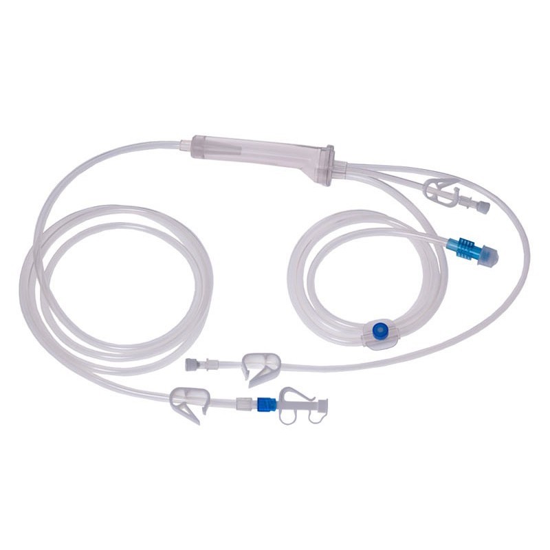 Equipo de hemodiálise composto de conector ao dialisador vermelho tampado, ramal de heparina com clamp e luer lock fêmea tampado, segmento de bomba de 8 mm, ramal de soro com clamp e luer lock fêmea tampado, ponto de infusão vermelho com ramal de tomada de pressão com clamp e luer lock fêmea tampado e conector a fístula vermelho tampado.