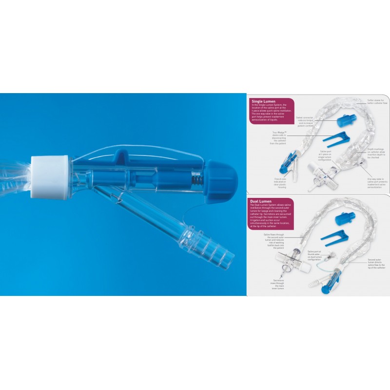 Sistema fechado para aspiração traqueal lumen único 10fr-52cm, 72 horas de permanencia, uso adulto, composto por sonda de aspiração traqueal em PVC siliconizada, centimetrada (51cm), marcação precisa, números visíveis, ponta atraumática contendo um orifício central e dois laterais, conector padrão 15mm em formato de “T