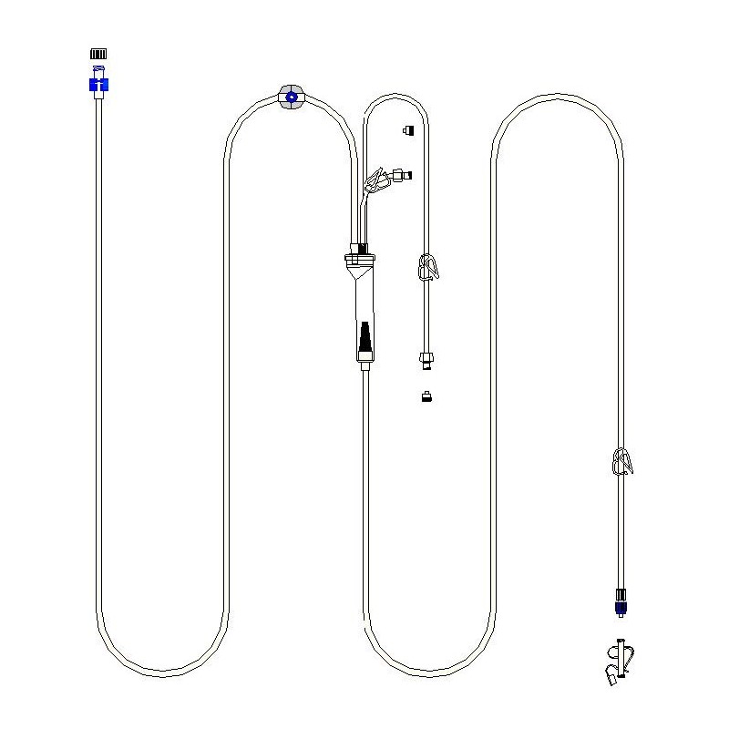 Equipo de hemodiálise composto de conector ao dialisador azul tampado, ponto de infusão azul, câmara chanfrada 3 vias com filtro (comprimento 14 ± 1