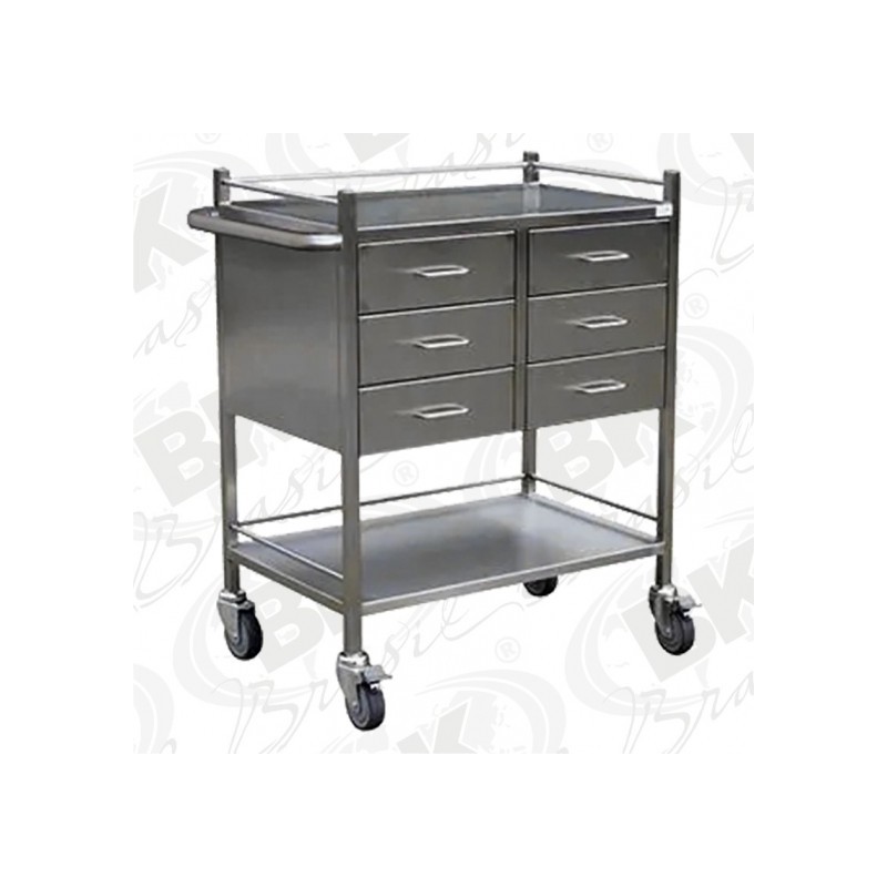 Estrutura, varandas, gavetas e prateleira totalmente confeccionadas em aço inoxidável AISI 304, com acabamento polido. Rodízios de 03”, com freios em diagonal. As gavetas são dotadas de guias telescópicas, que permitem que deslizem totalmente para parte de fora do gabinete.