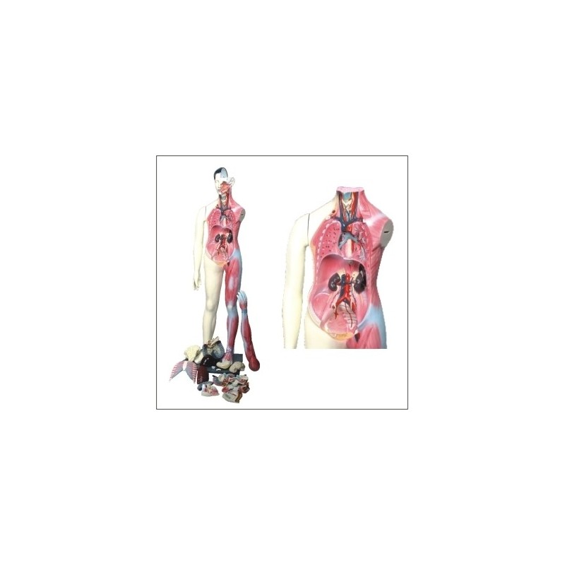 Modelo muscular em tamanho natural. Dividido em aproximadamente 30 partes, sendo que, de um lado é possível visualizar os músculos superficiais e do outro a anatomia normal.