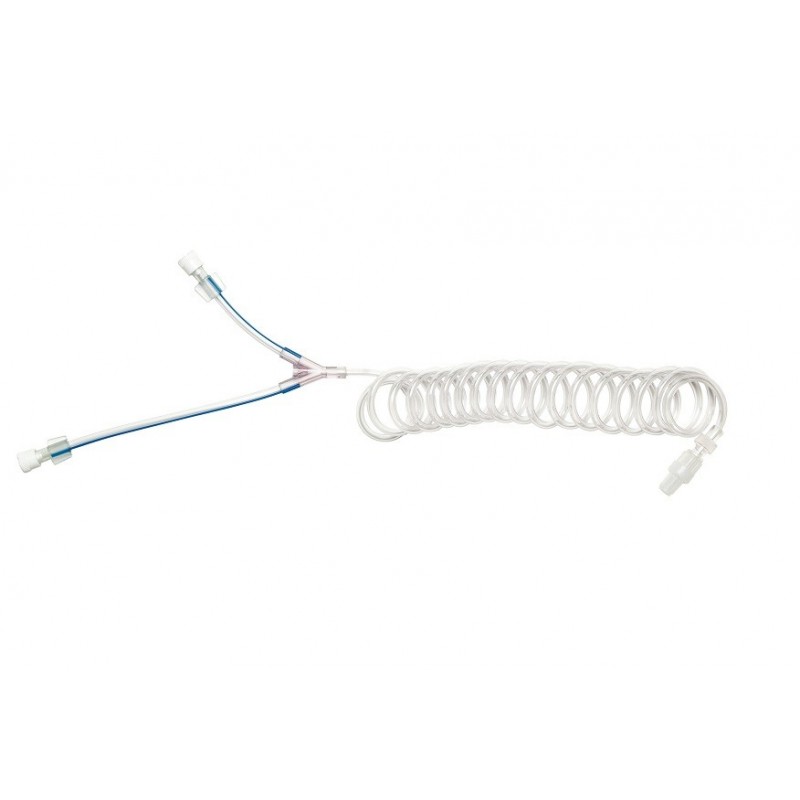 O Extensor em Y Espiralado 180 cm código E-180Y2 com 02 válvulas anti-refluxo nas extremidades é indicado para bomba injetora de contraste com duas cabeças. (até 300 PSI)