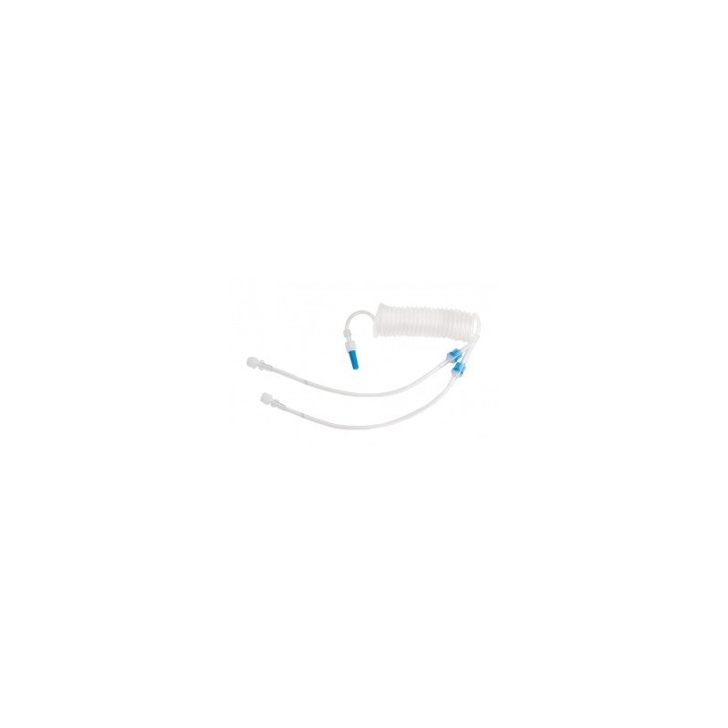 A parte proximal possui conexão Luer Lock Fêmea e é bifurcada no anelado com extensores de 25cm de comprimento aproximado c/ válvulas anti-refluxo.