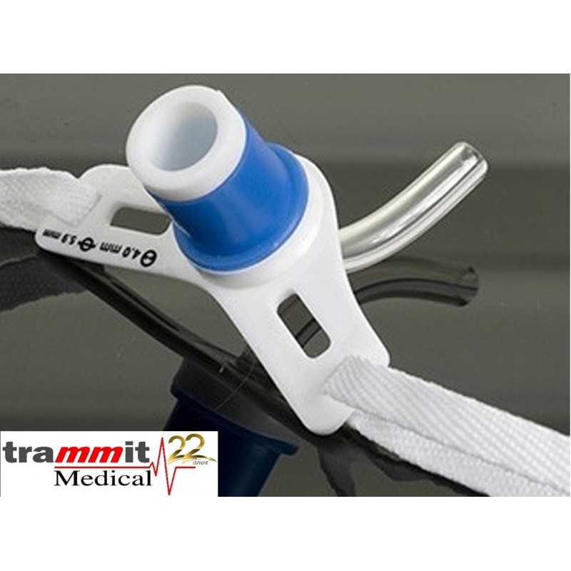 Cânula para traqueostomia em PVC termosensível descartável e transparente, sem balão, ponta retraída atraumática, mandril auxiliar a introdução e limpeza com ponta olivar, linha radiopaca contínua, conector colocado, placa (asa) de fixação flexível e fita de fixação em espuma de “nylon” azul, com velcro nas extremidades permitindo melhor ajuste, estéril. “Látex Free” Não contém DEHP