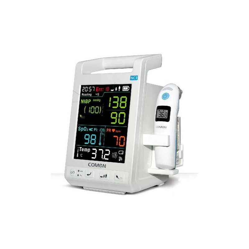 Parâmetros: Temperatura, oximetria e pressão arterial não-invasiva; Medições piroelétricas de infravermelho sem contato; Comunicação RF integrada, transmissão de dados sem fio; Técnica de medição rápida da pressão arterial; Alternância rápida entre os tipos de paciente; Medição rápida Masimo SPO2; 50 conjuntos de armazenamento de dados de medição de pressão arterial; Bateria de lítio com mais de 12 horas de operação contínua;