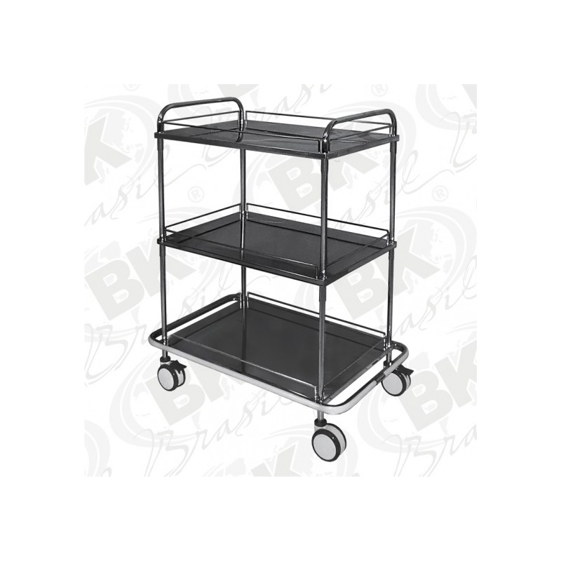 CARRO 03 PRATELEIRAS totalmente confeccionado em aço inoxidável. Prateleiras medindo 600x900 mm confeccionadas em aço inoxidável, espessura 1,2 mm; estrutura tubular em aço inoxidável, diâmetro 7/8" com espessura 1,2 mm de parede. Dotado de protetor contra choques em toda volta, confeccionado em PVC flexível branco. Modelo dotado de 04 rodízios giratórios de 05", sistema duplo rodado, com rolamentos internos, sendo 02 com freios em diagonal.