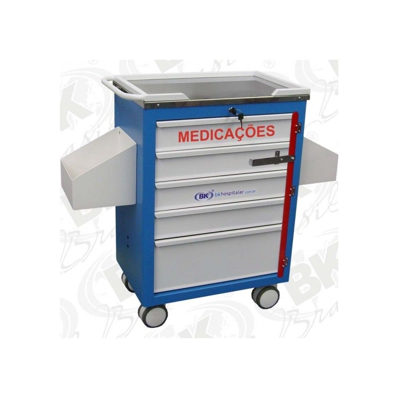 Confeccionado em chapa de aço com acabamento em pintura eletrostática a pó, com cantos arredondados. Mesa de administração confeccionada em aço inoxidável com acabamento polido. Composto de 05 gavetas, com guias deslizantes, sendo 01 delas dotada de divisórias moduláveis (possibilitam a adequação dos espaços de acordo com a quantidade de medicações). Possui também a 5.ª gaveta maior, para guarda de acessórios e outro utensílios. Modelo composto de suporte para almotolias e suporte para perfuro cortantes confeccionados em fiberglass. Montado sobre rodízios de 04” sistema duplo rodado, com sistema de freios em diagonal. Fornecido de sistema de fechadura total (com chave) para as gavetas.
