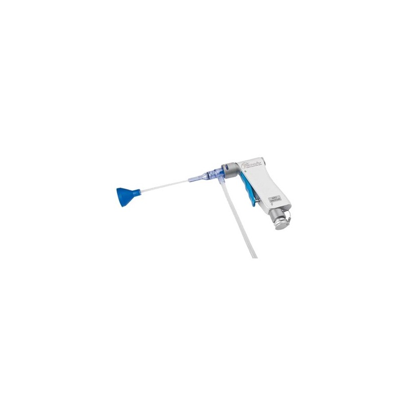 O produto gera um movimento pulsátil em uma membrana no cabeçote, o qual é transferido para o cartucho. Nota: cartucho da bomba e do bico são itens opcionais e possuem registro a parte. O produto vem acompanhado de uma mangueira pneumática, acondicionados em uma caixa autoclavavel. Todo este conjunto permite esterilização em autoclave, permitindo os protocolos normais de esterilização de instrumentos cirúrgicos.